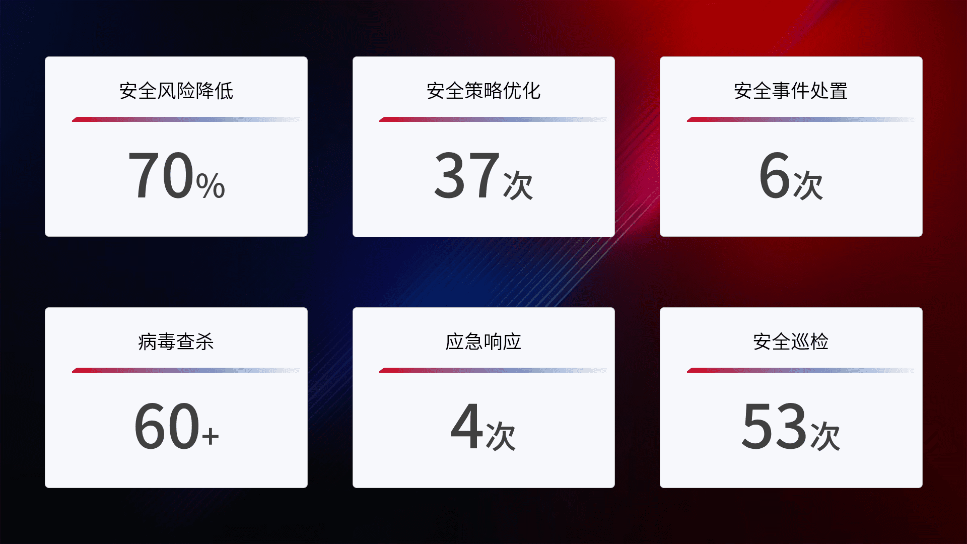提供全面的安全事件报告体系,,包括处置报告、、、周报、、季度和年度总结,,结合持续监控,,,帮助客户深入了解网络安全状况。。。。